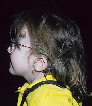 ![]() Paciente afectado con el síndrome de CHARGE. En el oído presenta un implante coclear. | ||