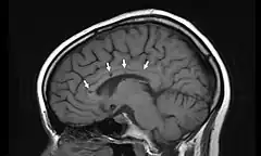 Vista lateral de una resonancia magnética nuclear de la cabeza. Las flechas indican la localización de microinfartos cerebrales característicos del síndrome de Susac. | ||