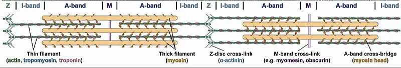 Más allá del disco Z o línea Z, que limita cada sarcómero, se encuentra la banda I, que rodea la línea Z, compuesta solamente por filamentos delgados. Después de la banda I se encuentra la banda A que contiene filamentos gruesos y delgados. Dentro de la banda A, se encuentra la zona H compuesta de filamentos gruesos y dentro de la zona H, se encuentra la línea M que está en el medio del sarcómero.[5]