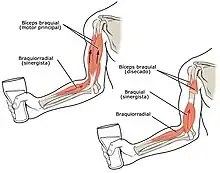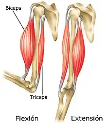 Los músculos agonistas son aquellos que al contraerse provocan la fuerza necesaria para realizar determinada acción. El músculo antagonista es el que al contraerse realiza la acción contraria. Por ejemplo al flexionar el codo el bíceps braquial actúa como músculo agonista, mientras que el tríceps braquial se relaja y funciona como antagonista. Sin embargo cuando se realiza la extensión del codo el tríceps se contrae y actúa como agonista y el bíceps se relaja y funciona como antagonista.[12][13]