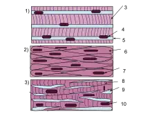 Existen básicamente tres tipos de tejido muscular: esquelético, cardiaco y liso. Los tres presentan la propiedad de la contractibilidad por la cual las células pueden disminuir y aumentar su longitud, pero difieren por sus características microscópicas, localización y la forma en que se regula la contracción que puede ser voluntaria a través de órdenes generadas en el lóbulo frontal del cerebro o involuntaria, es decir automática sin que intervenga la voluntad, tal como ocurre en el músculo cardiaco o en la capa muscular que está situada en la pared del intestino.[3][4] El tejido muscular está formado por células llamadas miocitos y también tiene cuatro propiedades principales que lo diferencian del resto de los tejidos:[2]
