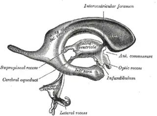 El tercer ventrículo es la cavidad del sistema ventricular situada en el diencéfalo, ocupada por líquido cefalorraquídeo que baña las estructuras del diencéfalo.