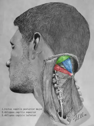 ![]() Los músculos que rodean el triángulo suboccipital. Músculo recto posterior mayor de la cabeza Músculo oblicuo superior de la cabeza Músculo oblicuo inferior de la cabeza | ||