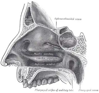![]() Pared lateral de la cavidad nasal. Velo del paladar (soft palate) visible abajo a la derecha. | ||
