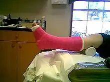 Un yeso corto en la pierna con una capa superior de fibra de vidrio que se utiliza para tratar un pie fracturado | ||
