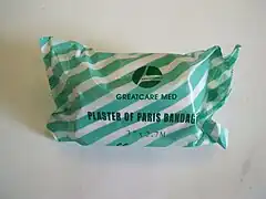 Las vendas de yeso consisten en una venda de algodón que se ha combinado con yeso de París, que se endurece después de mojarse. El yeso de París es yeso calcinado (yeso tostado), molido hasta obtener un polvo fino mediante molienda. Cuando se agrega agua, la forma más soluble de sulfato de calcio vuelve a la forma relativamente insoluble y se produce calor.