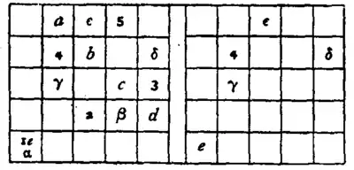 This is done by placing s1 on each of the n2 cubelets of the first cube that contain p1, and on the n2 cubelets of the 2d, 3d, . . . and nth cube that contain p2, p3, . . . pn respectively. This process is repeated with s2, beginning with the cube at which we ended, and so on with the other s’s; the n4 cubelets, after multiplying the q’s, r’s, and s’s by n, n2, and n3 respectively, will now be filled with the numbers from 1 to n4, and the constant summation will be Σn3s + Σn2r + Σnq + Σp. This process may be carried on without limit; for, if the n cubes are placed in a row with their faces resting on each other, and the corresponding faces looking the same way, n such parallelepipeds might be put side by side, and the n5 cubelets of this solid square be Nasically filled by the introduction of a new letter t; while, by introducing another letter, the n6 cubelets of the compound cube of n3 Nasik cubes might be filled by the numbers from 1 to n6, and so ad infinitum. When the root is an odd composite number the values of the three groups of letters have to be adjusted as in squares, also in cubes of an even root. A similar process enables us to place successive numbers in the cells of several equal squares in which the Nasical summations are the same in each, as in fig. 26.