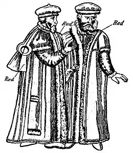 - ↑ These are well described in the account of the opening of parliament by Henry VIII. in 1537 given in Wriothesley’s Chronicle of England (Camden Soc., 1875, ed. W. Hamilton): “all erles marques and lordes, all in their Perliament robes of scarlett furred with white, and their hoodes about their neckes, which were forty in number; everie duke having fower barres of white fur alongest the right side of their robes, and everie earle having three bars, . . and everie lord two barres in likewise.”