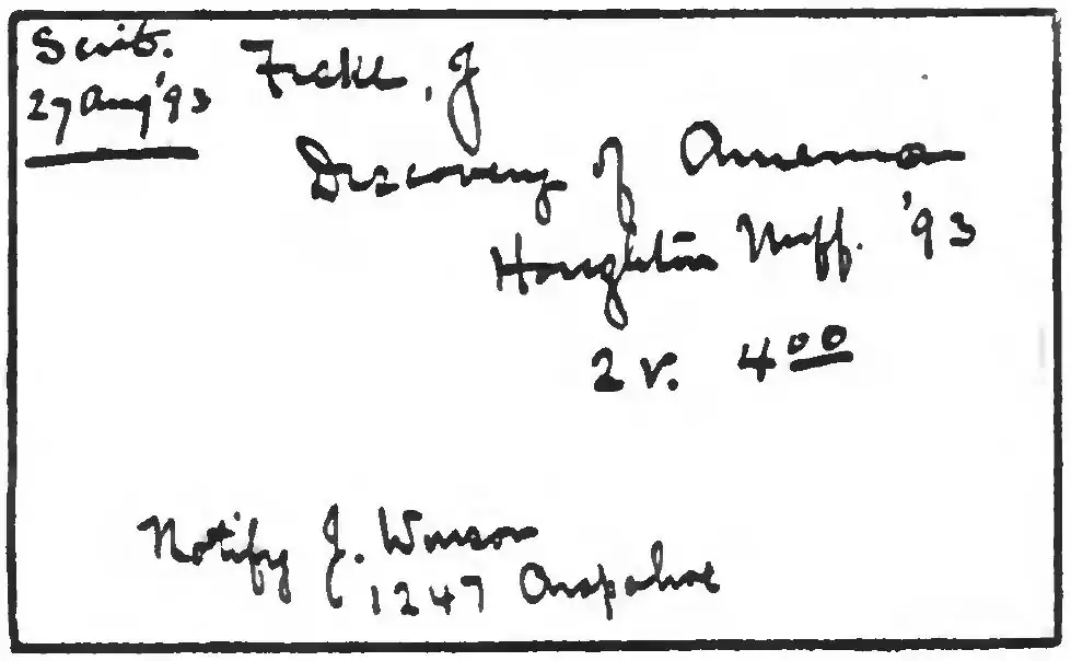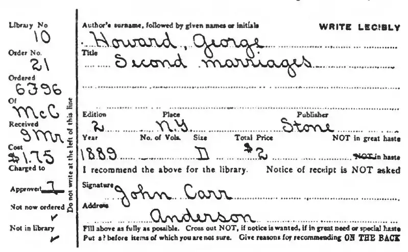 Keep a record of all books ordered. The best form of record is on slips, using a separate slip for each book. These order slips should have on them the author's surname, brief title, number of volumes, abbreviated note of place, publisher, year, publisher's price if known, name of dealer of whom ordered, date when ordered, and if its purchase has been requested by anyone that person's name and address.