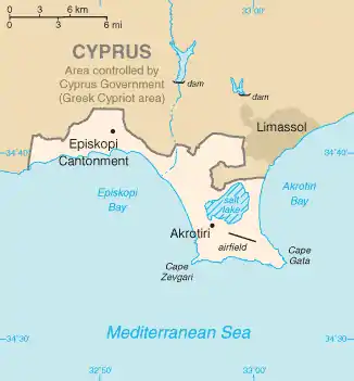 | Background: | By terms of the 1960 Treaty of Establishment that created the independent Republic of Cyprus, the UK retained full sovreignty and jurisdiction over two areas of almost 254 square kilometers in total: Akrotiri and Dhekelia. The southernmost and smallest of these is the Akrotiri Sovereign Base Area, which is also referred to as the Western Sovereign Base Area. |