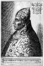 Alexander V, Pope (Pietro Philarghi), b. c. 1339, on the island of Crete (Candia), whence his appellation, Peter of Candia; elected 26 June, 1409; d. at Bologna, 3 May, 1410. A homeless beggar-boy in a Cretan city, knowing neither parents nor relations, he became the protégé of a discerning Capuchin friar, from whom he received an elementary education and under whose guidance he became a Franciscan in a Cretan monastery. The youth gave promise of extraordinary ability, and was sent to enjoy the superior educational advantages of Italy. He studied later at Oxford and finally at Paris where he distinguished himself as professor, preacher, and writer. He is the author of a good commentary on the "Sentences" of Peter Lombard.