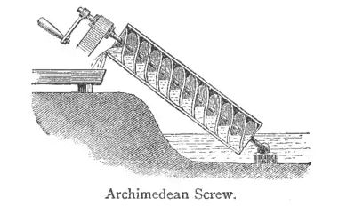 Archimedean, ärk-i-me-dē′an, adj. pertaining to Archimedes, a celebrated Greek mathematician of Syracuse (287-212 B.C.).—Archimedean screw, a machine for raising water, in its simplest form consisting of a flexible tube bent spirally round a solid cylinder, the ends of which are furnished with pivots, so as to admit of the whole turning round its axis.—Principle of Archimedes, a fundamental law in Hydrostatics, that a body when immersed in a fluid weighs less than it does in vacuo by the weight of the fluid it displaces.