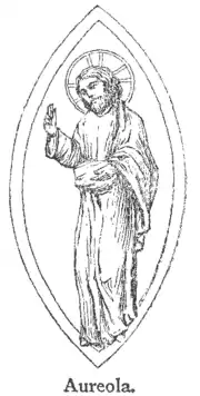 Aureola, awr-ē′o-la, n. in Christian art, the gold colour surrounding the whole figure in sacred pictures, distinct from the nimbus, which only covers the head, usually reserved for representations of the three Divine Persons, of Christ, and the Virgin and Child: (theol.) an increment to the ordinary blessedness of heaven gained by virgins, martyrs, and doctors for their triumph respectively over the flesh, the world, and the devil.—n. Aur′eole, the aureola: the gold disc round the head in early pictures symbolising glory: (fig.) a glorifying halo: a halo of radiating light, as in eclipses.—p.adj. Aur′eoled, encircled with an aureole. [L. aureolus, dim. of aureus, golden.]