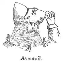 Aventail, Aventaile, av′en-tāl, n. the flap or movable part of a helmet in front, for admitting air to the wearer. [O. Fr. esventail, air-hole—L. ex, out, ventus, wind.]