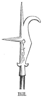 Bill, bil, n. a kind of concave battle-axe with a long wooden handle: a kind of hatchet with a long blade and wooden handle in the same line with it, often with a hooked point, used in cutting thorn hedges or in pruning.—ns. Bill′hook, a bill or hatchet having a hooked or curved point; Bill′man, a soldier armed with a bill. [A.S. bil; Ger. bille.]