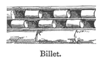 Billet, bil′et, n. a small log of wood used as fuel: (archit.) an ornament in Norman architecture resembling billets of wood.—n. Bill′et-head, a billet or round piece of wood fixed in the bow or stern of a whale-boat, round which the harpoon-line is turned when the whale is struck. [Fr. billette—bille, the young stock of a tree, prob. of Celt. orig., perh. allied to Bole, the trunk of a tree.]
