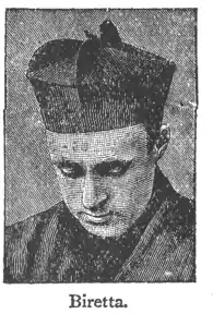 Biretta, bir-et′a, n. a square cap worn by clergy—by priests, black; bishops, purple; cardinals, red. [It. berretta—Low L. birretum, a cap.]
