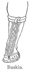 Buskin, busk′in, n. a kind of half-boot with high heels worn in ancient times by actors of tragedy—hence, the tragic drama as distinguished from comedy: a half-boot.—adj. Busk′ined, dressed in buskins, noting tragedy: tragic: dignified. [Ety. uncertain; cognates may be found in the O. Fr. brousequin; Dut. broos-ken; Sp. borceguí.]