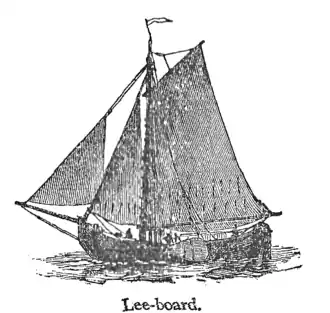 Lee, lē, n. the quarter toward which the wind blows.—adj. as in Lee′-side, the sheltered side of a ship.—ns. Lee′-board, a board lowered on the lee-side of a vessel, and acting like a keel or centre-board to prevent her from drifting to leeward; Lee′-gage, the sheltered or safe side:—opp. to Weather-gage; Lee′-shore, the shore opposite to the lee-side of a ship; Lee′-tide, a tide running in the same direction as the wind is blowing.—adj. Lee′ward, pertaining to, or in, the direction toward which the wind blows.—adv. toward the lee.—n. Lee′way, the distance a ship is driven to leeward of her true course: a falling behind.—Make up leeway, to make up for time lost; Under the lee, on the side sheltered from the wind, under shelter from the wind. [A.S. hleów, shelter; Ice. hlé, Low Ger. lee; prov. Eng. lew.]