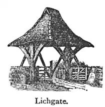 Lichgate, lich′gāt, n. a churchyard gate with a porch to rest the bier under.—ns. Lich′wake, the wake or watch held over a dead body—also Likewake, Lykewake, and even Latewake; Lich′way, the path by which the dead are carried to the grave. [M. E. lich—A.S. líc (Ger. leiche), geat, a gate.]