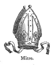 Mitre, mī′tėr, n. a head-dress worn by archbishops and bishops, and sometimes by abbots: (fig.) episcopal dignity: (archit.) a junction of two pieces, as of moulding, at an angle of 45°: a cap or cowl for a chimney or ventilator-pipe: a gusset in sewing, &c.—v.t. to adorn with a mitre: to unite at an angle of 45°.—adjs. Mī′tral, Mit′riform, having the form of a mitre: (bot.) conical, and somewhat dilated at the base.—ns. Mī′tre-joint, a joint between two pieces, each cut at an angle of 45°; Mī′tre-wheel, a bevel-wheel having its face inclined 45° to its axis. [Fr.,—L. mitra—Gr. mitra, belt, fillet.]