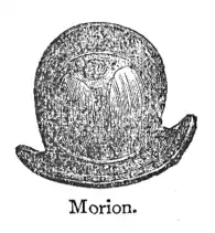 Morion, Morrion, mō′ri-un, n. a open helmet without visor or beaver. [Fr., prob. from Sp. morrion—morra, crown of the head. Diez suggests Basque murua, a hill.]