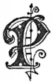 the sixteenth letter of our alphabet, its sound the sharp labial mute, interchanging with other labials, esp. with b, the flat labial mute: P=400; (P)=400,000: the chemical symbol for phosphorus: (math.) the Greek Π=a continued product, while small π denotes the ratio of the circumference to the diameter.—Mind one's p's and q's (see Mind).