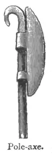 Pole-axe, pōl′-aks, n. a battle-axe consisting of an axe-head on a long handle: an axe used by sailors for cutting away rigging of ships. [Orig. pollax, from poll, the head, and axe.]