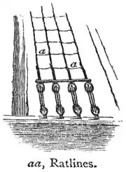 Ratline, Ratlin, rat′lin, n. one of the small lines or ropes traversing the shrouds and forming the steps of the rigging of ships—also Rat′ling, Ratt′ling.—n. Rat′line-stuff (naut.), a tarred rope from which ratlines are made. [Prob. rat-lines.]
