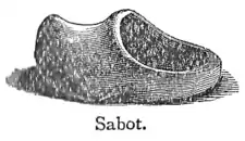 Sabot, sä-bō′, n. a wooden shoe, worn by the French peasantry: a piece of soft metal attached to a projectile to take the groove of the rifling.—n. Sabotier′, a wearer of wooden shoes: a Waldensian. [Fr. sabot—Low L. sabbatum, a shoe.]