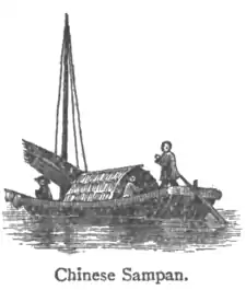Sampan, sam′pan, n. a small boat used in China and Japan.—Also San′pan. [Chin. san, sam, three, pan, a board.]