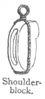 Shoulder, shōl′dėr, n. the part of the trunk between the neck and the free portion of the arm or fore-limb, the region about the scapula: the upper joint of the foreleg of an animal cut for market: anything resembling the shoulder, a rising part, a prominence: that which sustains, support, the whole might or effort: the whole angle of a bastion between the face and flank.—v.t. to push with the shoulder or violently: to take upon the shoulder: to fashion with a shoulder or abutment.—v.i. to force one's way forward.—ns. Shoul′der-belt, a belt that passes across the shoulder; Shoul′der-blade, the broad, flat, blade-like bone (scapula) of the shoulder; Shoul′der-block, a pulley-block left nearly square at the upper end and cut away towards the sheave; Shoul′der-bone, the humerus, shoulder-blade; Shoul′der-clap′per (Shak.), one who claps another on the shoulder or uses great familiarity, a bailiff.—adj. Shoul′dered, having shoulders of a specified kind.—ns. Shoul′der-knot, a knot worn as an ornament on the shoulder, now confined to servants in livery; Shoul′der-piece, a strap passing over the shoulder and joining the front and back part of a garment; Shoul′der-slip, a sprain of the shoulder.—adjs. Shoul′der-slipped, Shoul′der-shot′ten (Shak.), having the shoulder-joint dislocated.—n. Shoul′der-strap, a strap worn on or over the shoulder: (U.S.) a narrow strap of cloth edged with gold-lace worn on the shoulder to indicate military and naval rank.—Shoulder-of-mutton sail, a kind of triangular sail of peculiar form, used mostly in boats, very handy and safe, particularly as a mizzen; Shoulder to shoulder, with hearty and united action or effort.—Give, Show, or Turn the cold shoulder (see Cold); Put, or Set, one's shoulder to the wheel, to give personal help heartily; With one shoulder, with one consent. [A.S. sculder, sculdor; Ger. schulter, Dut. schouder.]