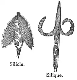 Silicle, sil′i-kl, n. (bot.) a seed-vessel shorter and containing fewer seeds than a silique—also Sil′icule, Silic′ula.—adj. Silic′ulōse (bot.), having, pertaining to, or resembling silicles: husky.—ns. (bot.) Silique (si-lēk′), Sil′iqua, the two-valved elongated seed-vessel of the Cruciferæ.—adjs. Sil′iquiform, Sil′iquose, Sil′iquous (bot.), pertaining to, resembling, or bearing siliques. [L. silicula, dim. of siliqua, a pod.]