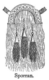 Sporran, spor′an, n. an ornamental pouch worn in front of the kilt by the Highlanders of Scotland. [Gael, sporan.]