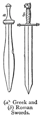 Sword, sōrd, n. an offensive weapon with a long blade, sharp upon one or both edges, for cutting or thrusting: destruction by the sword or by war, war, military force: the emblem of vengeance or justice, or of authority and power.—adj. Sword′-and-buck′ler, fought with sword and buckler, not the rapier: armed with sword and buckler.—ns. Sword′-arm, -hand, the arm, hand, that wields the sword; Sword′-bay′onet, a bayonet shaped somewhat like a sword, and used as one; Sword′-bear′er, a public officer who carries the sword of state; Sword′-belt, a military belt from which the sword is hung; Sword′bill, a South American humming-bird with a bill longer than its body; Sword′-break′er, an old weapon for grasping and breaking an adversary's sword; Sword′-cane, -stick, a cane or stick containing a sword; Sword′craft, skill with the sword; military power; Sword′-cut, a blow, wound, or scar caused by the edge of a sword; Sword′-dance, a dance in which the display of naked swords, or movements made with such, form a part; Sword′-doll′ar, a Scotch silver coin under James VI., worth 2s. 6d. in English money, having a sword on the reverse; Sword′er (Shak.), a swordsman; Sword′fish, a family of spiny-rayed Teleostean fishes, sometimes 12 to 15 feet in length, with a sword about 3 feet long, formed from a compressed prolongation of the upper jaw; Sword′-flag, the European water-flag or yellow iris; Sword′-grass, a kind of sedge; Sword′-guard, the part of a sword-hilt that protects the bearer's hand; Sword′-knot, a ribbon tied to the hilt of a sword; Sword′-law, government by the sword.—adj. Sword′less, destitute of a sword.—ns. Sword′play, fencing; Sword′player, a fencer.—adj. Sword′-proof, capable of resisting the blow or thrust of a sword.—n. Sword′-rack, a rack for holding swords.—adj. Sword′-shaped, ensiform.—ns. Swords′man, a man skilled in the use of a sword; Swords′manship. [A.S. sweord; Ice. sverdh, Ger. schwert.]