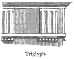Triglyph, trī′glif, n. a three-grooved tablet at equal distances along the frieze in Doric architecture.—adjs. Triglyph′ic, -al, consisting of, or pertaining to, triglyphs: containing three sets of characters or sculptures. [L. triglyphus—Gr. triglyphos—treis, three, glyphein, to carve.]