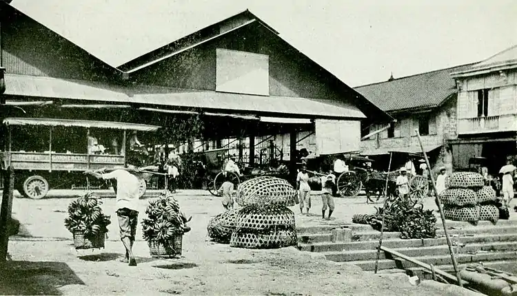 MANILA, the chief town of the Philippine Islands and capital of Luzon; on the E. side of a wide bay on the S. W. coast of Luzon, 650 miles S. E. of Hong Kong, with which city it has been connected by telegraph since 1881. It is divided into two portions by the Pasig river. On the S. bank stands the old town (founded in 1571 by Legazpi), surrounded by crumbling walls, with tolerably wide, straight streets crossing each other at right angles. Here are the archbishop's palace, numerous churches and monasteries, the cathedral, university, Jesuit observatory, arsenal, and government offices. On the N. bank are the modern suburbs, the commercial and native quarters. Under American rule the general aspect of the city has greatly changed. Suburbs have been developed along modern lines, and many important public buildings have been erected. The most important industries are the manufacture of cigars, furniture, shoes, and manufactories of hemp. The harbor has been enlarged and dredged and accommodates the largest vessels. A railway extends from Manila to Dagupan, a distance of 120 miles. The principal port of the Philippines, Manila has an export trade valued approximately at over $50,000,000 annually, and an import trade that falls but little short of that figure. Sugar, hemp, cigars and tobacco, and coffee account for three-fourths of the exports, and cotton goods, rice, wine, silk, flour, machinery and metal goods are the chief imports.