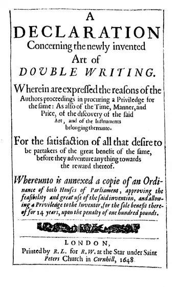 The Lords and Commons assembled in Parliament, having by severall Certificats from credible men received full satisfaction, not onely of the feasibility of a late invention of double and multiple writing, found out and discovered by the industry of William Petty, and by him made practicable by Instruments, and means of severall natures and fashions, but also of the great use and profit which may redonnd to the Common-wealth in generall, and especially to those who have much and frequent use of writing, and being desirous to encourage not only the pains and labour of William Petty, but also of all others that shall bend their thoughts to the search of such secrets as shall be profitable to the Common-wealth, doe Ordain, and be it Ordered and Ordained, by the Lords and Commons in Parliament, that the said William Petty, shall have the sole benefit of his said inventions to him or his asignes, for and during the term of 14 years, either by teaching, or otherwise discovering the same, or by the sale of such Instruments as are usefull to the practice of the said Art: Prohibiting and strictly forbidding all or any person or persons whatsoever for and during the said terme, the sale or use of any of the said Instrument or Instruments, or practice of the said Art upon any other Instruments (It being an easie matter to adde unto, or otherwise to alter these, which are already contrived by the said William Petty) without the license of him the said Inventor, or his Assignes, upon the penalty of a hundred pound, to be forfeited to his or their use, forasmuch as it will be very difficult to discover any such delinquents.