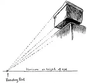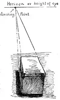 In other words, it is not reasonable to assume two horizons in drawing one object. If more of one side of the box is seen than the other, then the side of which we have the broader view will have its vanishing point farther away. The side of the box presenting a more acute angle will have its vanishing point nearer.