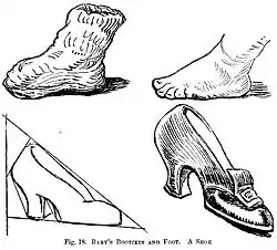 Fashion inflicts queer shapes on the foot. At one time it insists that all our shoes shall be narrow and peaked, another time squat and round-toed; then heels must be worn like stilts, or shaved down to the thinnest substance.