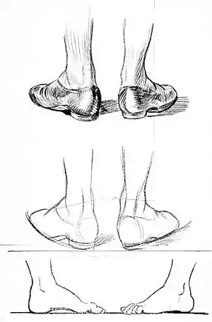 Having marked the angles of the leg and foot, we should next notice the straight tendon that runs down between the ankles and spread into the firm swelling apex of the heel. On either side of the foot the ankles are clearly seen. Note the shapes well, and note also the height of the upper part of the foot (this is always the widest section), and its sharp descent to the toes. Seen from the rear these toes present a blunted and rather flattened curve. Trace the flat under-surface of the foot, the tread and balance first, afterward the curves of the heel, and the space between the instep and the ground, remembering, always, the foot within the shoe.