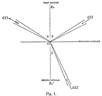 Now the energy of a monochromatic plane polarized ray of frequency proceeding from an element of the boundary surface within the elementary cone in a direction toward the first medium (see the feathered arrow at the left in Fig. 1) is for the time , in accordance with and :