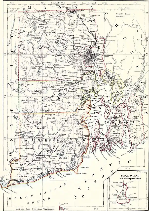 Cities and Towns.—The five counties into which Rhode Island is divided contain in all thirty-six towns and cities, of which six lie on the narrow strip bordering the eastern shore of the bay, five on islands in the bay and ocean, and the remaining twenty-five on the mainland, to the west and north-west of the bay. By the State census of 1885 six cities and towns had a population exceeding 10,000:—Providence, 117,607; Pawtucket, 22,873; Newport, 20,339; Lincoln, 17,262; Woonsocket, 16,005; Warwick, 13,281. Only two of these places, Providence and Newport, have hitherto been organized as cities; but a third, Pawtucket (the largest in the country under a town government), is also now (1885) about to be organized under a city charter. The quaint old city of Newport, situated at the southern end of the island (Rhode