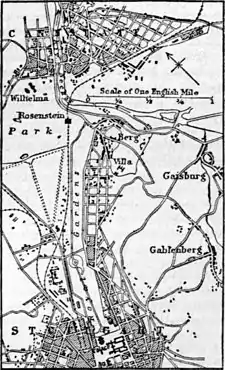 To the north-east of the new palace lies the beautiful palace park, embellished with statuary and artificial sheets of water, and extending nearly all the way to Cannstatt, a distance of over two miles. Cannstatt, a town with (1880) 16,205 inhabitants, is not officially incorporated with Stuttgart, but may be looked on as practically forming part of it. Its beautiful situation on the Neckar, its tepid saline and chalybeate springs, and its educational advantages attract numerous visitors. In the environs of Stuttgart and Cannstatt lie Rosenstein, the Solitude, Hohenheim, the Wilhelma, and other royal chateaus.