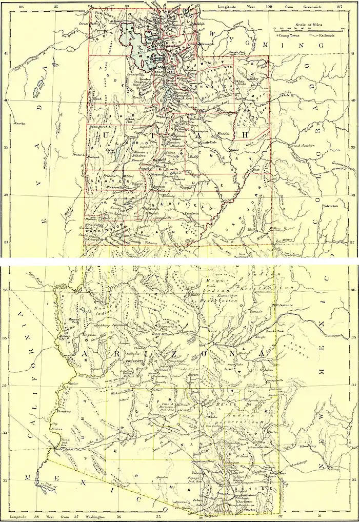 Plate II. UTAH, a Territory of the United States, bounded on the N. by Idaho and Wyoming, on the E. by Colorado, on the S. by Arizona, and on the W. by Nevada. The eastern boundary coincides with 109° and the western with 114° W. long. The southern boundary is the 37th parallel of latitude; the northern is on the 42d parallel between the meridians of 114° and 111°, while east of the latter meridian it follows the 41st parallel. The area of Utah is 84,970 square miles.