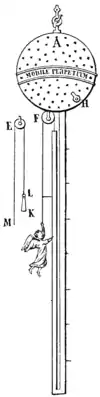 so as to form a very narrow U, in which was placed a certain amount of alcohol. The shorter arm of the U was open at the top; on the liquid within it floated a tiny inverted cup of brass foil to which a cord was attached that passed around a wheel, hung upon the underside of the globe, and carried at the other end a little figure of an angel pointing to the scale on the tube; the tube was concealed from the observer by a wooden case, and the image hung without. A valve at one side of the large copper sphere permitted enough air to be withdrawn by means of the air-pump, to adjust the height of the image, which hung about half way up the tube. On the fifteen-foot scale were the words: "Magum frigus, aer frigidus, aer subfrigidus, aer temperatus, aer subcalidus, aer calidus, magnus calor;" and the large sphere above the tube was inscribed "Mobile perpetuum."