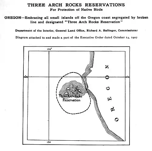 It is hereby ordered that the group of small unsurveyed islands known as the "Three Arch Rocks," located in the Pacific Ocean from one-half mile to one mile off the coast of Oregon, approximately in latitude 45° 28′ north, 124° west from Greenwich, as shown upon the United States Coast Survey Chart No. 6100, and located within the area segregated by a broken line and shown upon the diagram hereto attached and made a part of this order, is hereby reserved and set aside for the use of the Department of Agriculture as a preserve and breeding ground for native birds and animals. This reservation to be known as Three Arch Rocks Reservation.