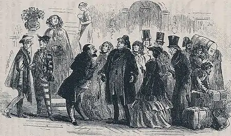 Mr Gowan stood aloof with his cigar and pencil, but Mr Blandois was on the spot to pay his respects to the ladies. When he gallantly pulled off his slouched hat to Little Dorrit, she thought he had even a more sinister look, standing swart and cloaked in the snow, than he had in the fire-light over-night. But, as both her father and her sister received his homage with some favour, she refrained from expressing any distrust of him, lest it should prove to be a new blemish derived from her prison birth.
