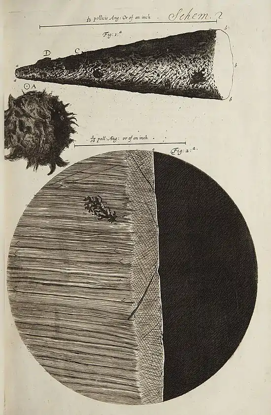 We will begin these our Inquiries therefore with the Observations of Bodies of the most simple nature first, and so gradually proceed to those of a more compounded one. In prosecution of which method, we shall begin with a Physical point; of which kind the Point of a Needle is commonly reckon’d for one; and is indeed, for the most part, made so sharp, that the naked eye cannot distinguish any parts of it: It very easily pierces, and makes its way through all kind of bodies softer then it self: But if view'd with a very good Microscope, we may find that the top of a Needle (though as to the sense very sharp) appears a broad, blunt, and very irregular end; not resembling a Cone, as is imagin’d, but onely a piece of a tapering body, with a great part of the top remov’d, or deficient. The Points of Pins are yet more blunt, and the Points of the most curious Mathematical Instruments do very seldome arrive at so great a sharpness; how much therefore can be built upon demonstrations made onely by the productions of the Ruler and Compasses, he will be better able to consider that shall but view those points and lines with a Microscope.