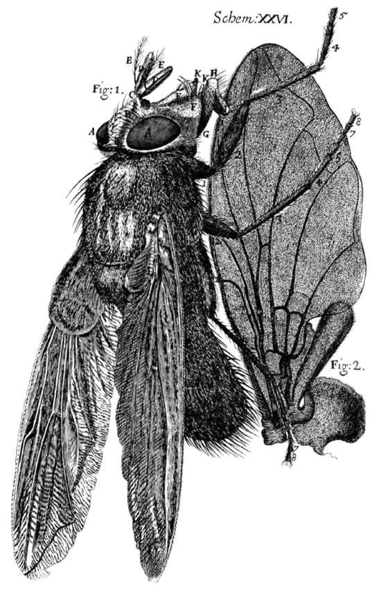 This kind of Fly, whereof a Microscopical Picture is delineated in the first Figure of the 26. Scheme, is a very beautifull creature, and has many things about it very notable; divers of which I have already partly describ'd, namely, the feet, wings, eyes, and head, in the preceding Observations.
